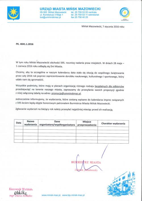 Burmistrz Miasta Mińsk Mazowiecki Marcin Jakubowski podpisał List Intencyjny w sprawie przystąpienia do realizacji wieloletniego projektu wydawniczego z okazji zbliżającego się 600-lecia nadania praw miejskich miastu Mińsk Mazowiecki, co nastąpiło 29 maja 1421 roku za sprawą rycerza Jana z Gościańczyc i Księcia Janusza I Starszego.