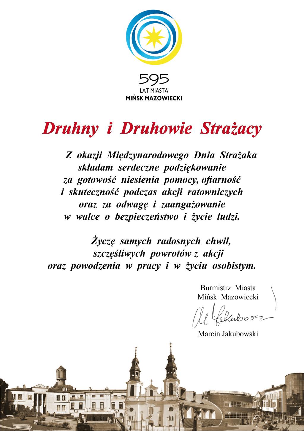 Chciałbym bardzo serdecznie wszystkim Państwu podziękować za obecność na dzisiejszych uroczystościach. Licznie przybyłym pocztom sztandarowym, Miejskiej Orkiestrze Dętej, kombatantom i żołnierzom, oficjalnym delegacjom, naszym gościom i wszystkim przybyłym dziękuję za uświetnienie 3-cio majowych obchodów. Dziękuję mieszkańcom naszego miasta, którzy wywiesili flagi państwowe. Gest ten jest przejawem prawdziwej świadomości narodowej. Dziękuję też Czcigodnemu Księdzu Proboszczowi oraz wszystkim duchownym za przygotowanie Mszy Świętej za Ojczyznę, na którą Wszystkich Państwa serdecznie zapraszam.