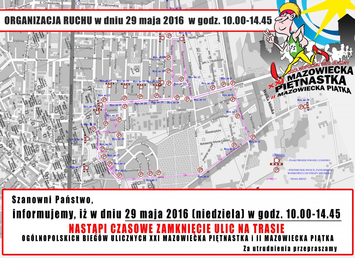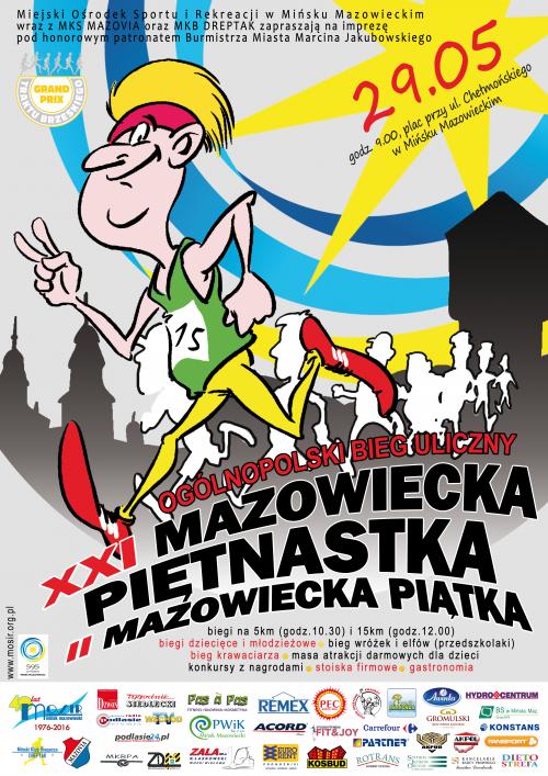 W dniu 29 maja 2016 na placu przy ul. Chełmońskiego w Mińsku Mazowieckim odbyło się wspaniałe widowisko sportowe, które jako Miejski Ośrodek Sportu i Rekreacji mamy przyjemność organizować nieprzerwanie od 21 lat. Od kilku edycji w czynną organizację imprezy włączyli się również MKS Mazovia oraz MKB Dreptak. Ogólnopolskie Biegi Uliczne XXI Mazowiecka Piętnastka i II Mazowiecka Piątka to dwa atestowane dystanse, które w tym roku przyciągnęły na start kolejno 328 oraz 290 osób. Oba biegi, drugi rok z rzędu, zostały wpisane w szeroko zakrojoną inicjatywę Grand Prix Traktu Brzeskiego. Inicjator każdego z przedsięwzięć, czyli Gmina Wiązowna, Klub Biegacza Biała Biega, Yulo Run Team Siedlce, Agencja Rozwoju Miasta Siedlce oraz MOSiR Mińsk Mazowiecki, proponuje udział w dwóch biegach, tj. Półmaraton Wiązowski (5km, półmaraton), Rodzinny Piknik Biegowy Biała Biega (10 i 15km), Biegiem przez Platerów (10km), Bieg Siedleckiego Jacka (5km, półmaraton) oraz Ogólnopolskie Biegi Uliczne (5 i 15km). Podstawą klasyfikacji jest pokonanie czterech dystansów (5, 10, 15km oraz półmaratonu) w określonym przez organizatorów limicie czasowym. Na szczególną uwagę zasługuje fakt, iż medal zdobyty w każdym mieście tworzy z pozostałymi zintegrowaną całość, tj. trasę traktu brzeskiego.