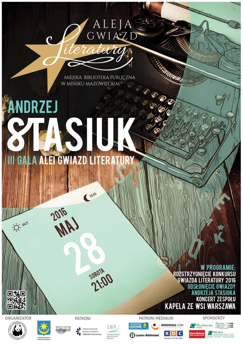 Ostatnia sobota maja zawsze jest niezwykła, bo właśnie tego dnia przed Miejską Biblioteką Publiczną w Mińsku Mazowieckim w „Alei Gwiazd Literatury” przybywa kolejna gwiazda. Bohaterem tegorocznej Gali był Andrzej Stasiuk - postać doceniana przez czytelników i krytyków literackich na całym świecie. Tego wieczoru licznie zgromadzona przed biblioteką publiczność, oczekiwała w napięciu na przybycie wyjątkowego gościa. Andrzej Stasiuk nie kazał na siebie długo czekać, punktualnie podjechał pod czerwony dywan terenowym samochodem, wpisując się tym samym w tradycje wydarzenia. Przypomnijmy, że w 2014 r. Julia Hartwig, na inaugurację Alei, przyjechała angielską limuzyną, a Janusz Głowacki w ubiegłym roku dojechał na Galę żółtą nowojorską taksówką.