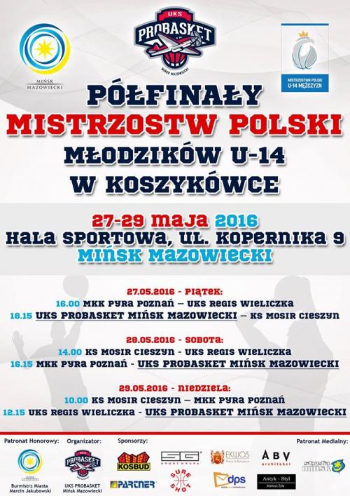 PÓŁFINAŁY MISTRZOSTW POLSKI MŁODZIKÓW U-14 W KOSZYKÓWCE CHŁOPCÓW, których organizatorem jest UKS PROBASKET, Uks Probasket Mińsk Mazowiecki w ramach obchodów 595-lecia nadania praw miejskich - 27-29 maja 2016 r. Zespół Szkół Miejskich nr 1 przy ul. Kopernika 9.