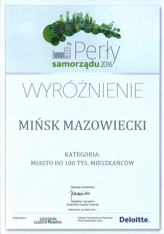 Mińsk Mazowiecki znalazł się w pierwszej dziesiątce najlepszych miast do 100 tys. mieszkańców według prestiżowego rankingu Dziennika Gazety Prawnej „Perły Samorządu 2016”.