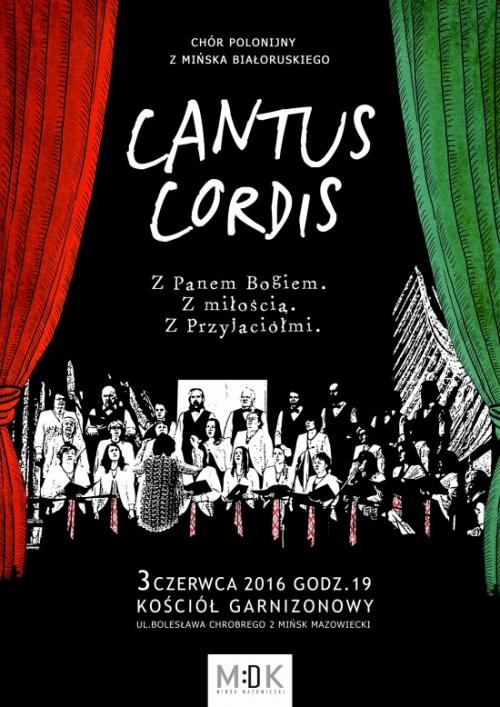Chór CANTUS CORDIS jest zespołem amatorskim, miesznym, czterogłosowym. Należy do niego 35 osób w wieku od 16 do 65 lat. To są osoby różnych zawodów. W repertuarze chóru są pieśni religijne, patriotyczne, piosenki ludowe, biesiadne, rozrywkowe oraz utwory klasyczne. „CANTUS CORDIS” bierze udział w okolicznościowych imprezach kulturalnych i religijnych na Białorusi (w Pińsku, Baranowiczach, Mołodecznie, Mosarzu, Iszkołdziu, Dzierżyńsku, Uździe, Budsławiu oraz w Polsce: w Warszawie, Brodnicy, Aleksandrowie Kujawskim, Licheniu, na Jasnej Górze w Częstochowie, Zamościu, Lublinie, Wrocławiu, Gorzowie Wielkopolskim i tp.). Chór zajmuje się między innymi oprawą muzyczną niedzielnych Mszy Świętych w języku polskim w kościele pw. św. Szymona i św. Heleny w Mińsku.