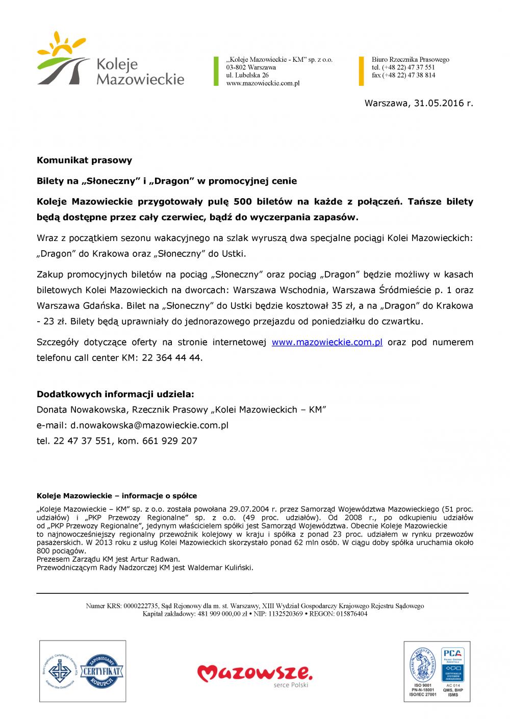 Tej nocy uczestnicy Nocy Muzeów będą jeździć pociągami Kolei Mazowieckich za darmo. Nieodpłatne przejazdy będą obowiązywały od 14 maja 2016 r. od godz. 17.00 do 15 maja 2016 r. do godz. 1.00. Przejazd powrotny będzie odbywał się nieodpłatnie na podstawie zakupionego wcześniej
