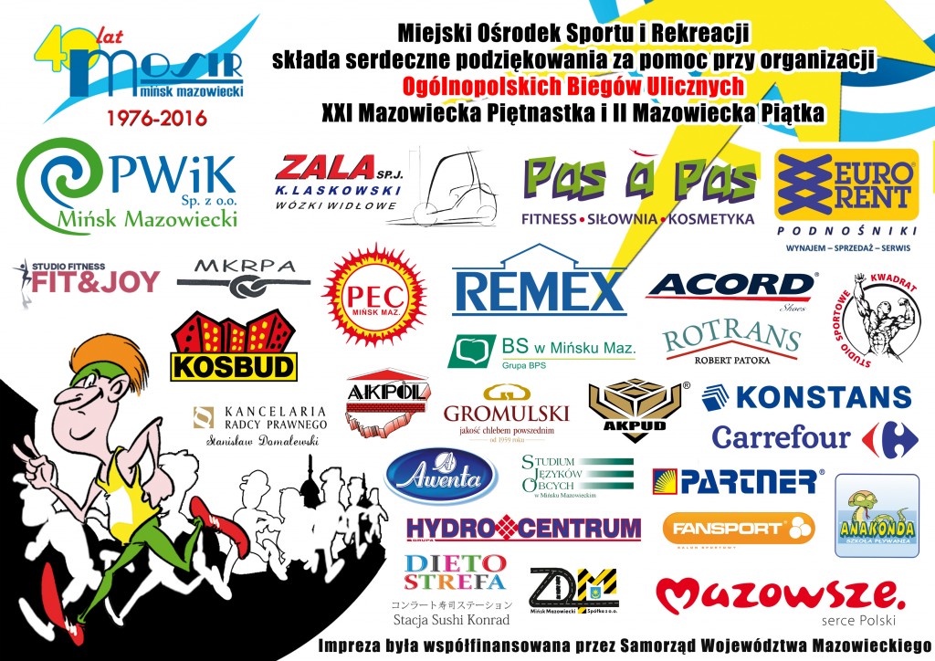 Dziękujemy za wsparcie sponsorom: Polskiemu Bankowi Spółdzielczemu w Wyszkowie, Studium Języków Obcych w Mińsku Mazowieckim, Bankowi Spółdzielczemu w Mińsku Mazowieckim, Euro – School Szkole Języków Obcych w Mińsku Mazowieckim i restauracji Iwo Sushi w Mińsku Mazowieckim.