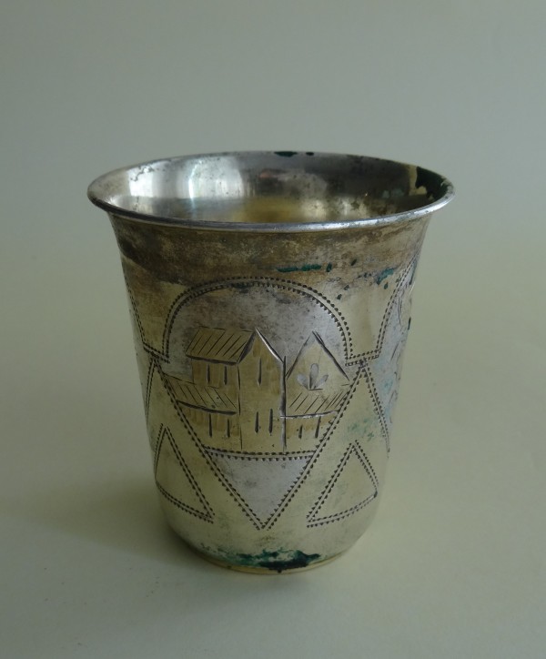 1. Kubek kiduszowy - srebro częściowo złocone pr. „84”, Kijów 1880 – 1890, grawerowane motywy architektoniczne i roślinne, masa 50,72 g, wys. 6,8 cm, stan zachowania dobry