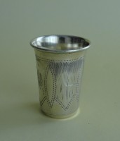 13. Kubek kiduszowy - srebro pr. „84”, Moskwa 1899 – 1908, probierz И.Л. (Iwan Lebiedkin), ślady złocenia, grawerowane motywy kwiatowe, masa 27,94 g, wys. 4,8 cm