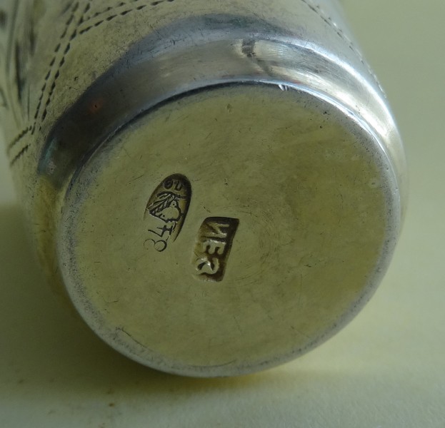 12. Kubek kiduszowy - srebro pr. „84”, Moskwa 1899 – 1908, probierz И.Л. (Iwan Lebiedkin), ślady złocenia, grawerowane motywy kwiatowe, masa 27,94 g, wys. 4,8 cm