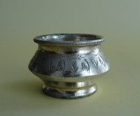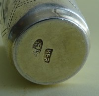 7. Kubek kiduszowy - srebro pr. „84”, Rosja ok. poł XIX w., grawerowane niellowane motywy architektoniczne i roślinne, znaki złotnicze i data nieczytelne (zanieczyszczenia grynszpanem), masa 29,44 g, wys. 4,5 cm