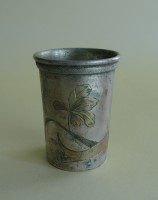 4. Kubek kiduszowy - srebro złocone pr. „84”, 1899 – 1908, probierz Л. О. (?), grawerowane motywy roślinne, masa 12 g, wys. 4 cm