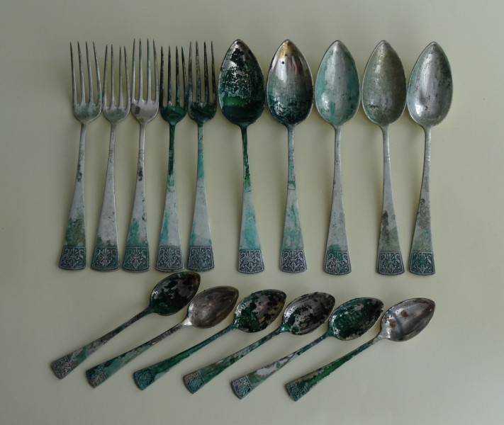 15. Zestaw sztućców: 5 łyżek do zupy, 5 widelców, 6 łyżeczek do herbaty, srebro pr. „3”, Warszawa 1920 – 1939, masa 940 g
