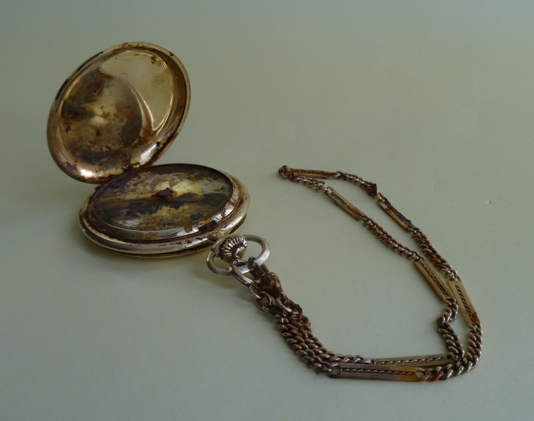 3 koperty, złoto pr. 14 k („56”), kryty, mechanizm, mechanizm ankrowy „Tavannes Watch co…”, na wewnętrznej kopercie wygrawerowane: „Grand Prix dla firmy w Brukseli w 1910 r. i w Berlinie w 1914 r.”, powierzchnia giloszowana, lata 20-te XX w., dewizka złoto p. „3”, Warszawa 1920 – 1939, masa brutto z dewizką 87,60 g