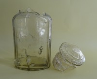 szkło bezbarwne z formy, z wytłoczonym motywem Eskulapa, brak korka, korpus pęknięty, koniec XIX w., wys. 13 cm