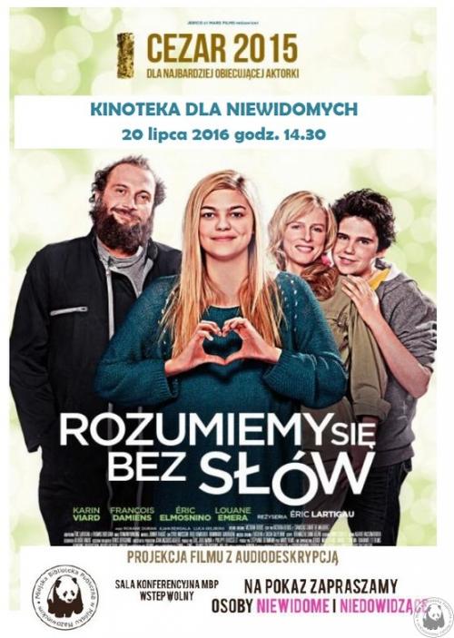 Serdecznie zapraszamy osoby niewidome oraz niedowidzące na koleją edycję Kinoteki dla niewidomych. W dniu 20 lipca o godzinie 14.30 odbędzie się pokaz filmu "Rozumiemy się bez słów" z audiodeskrypcją.
