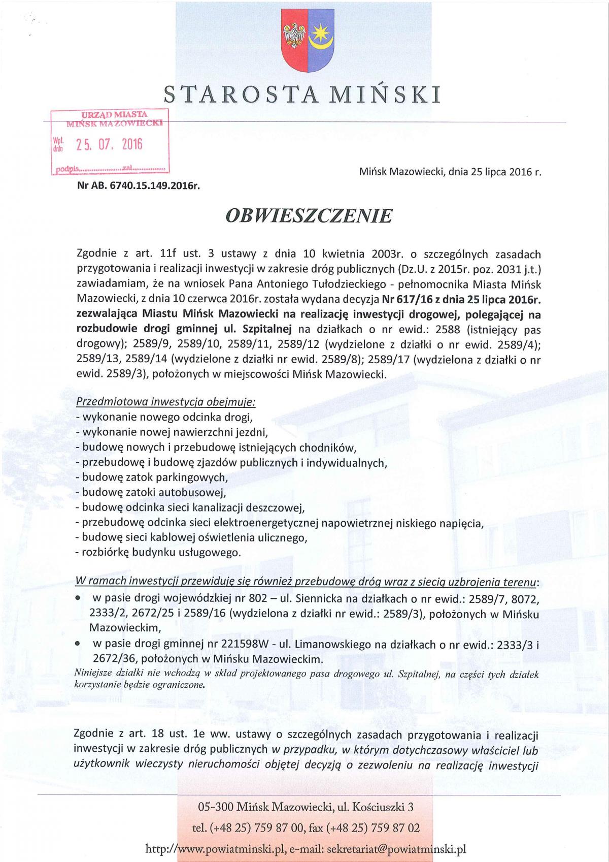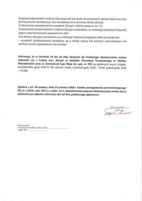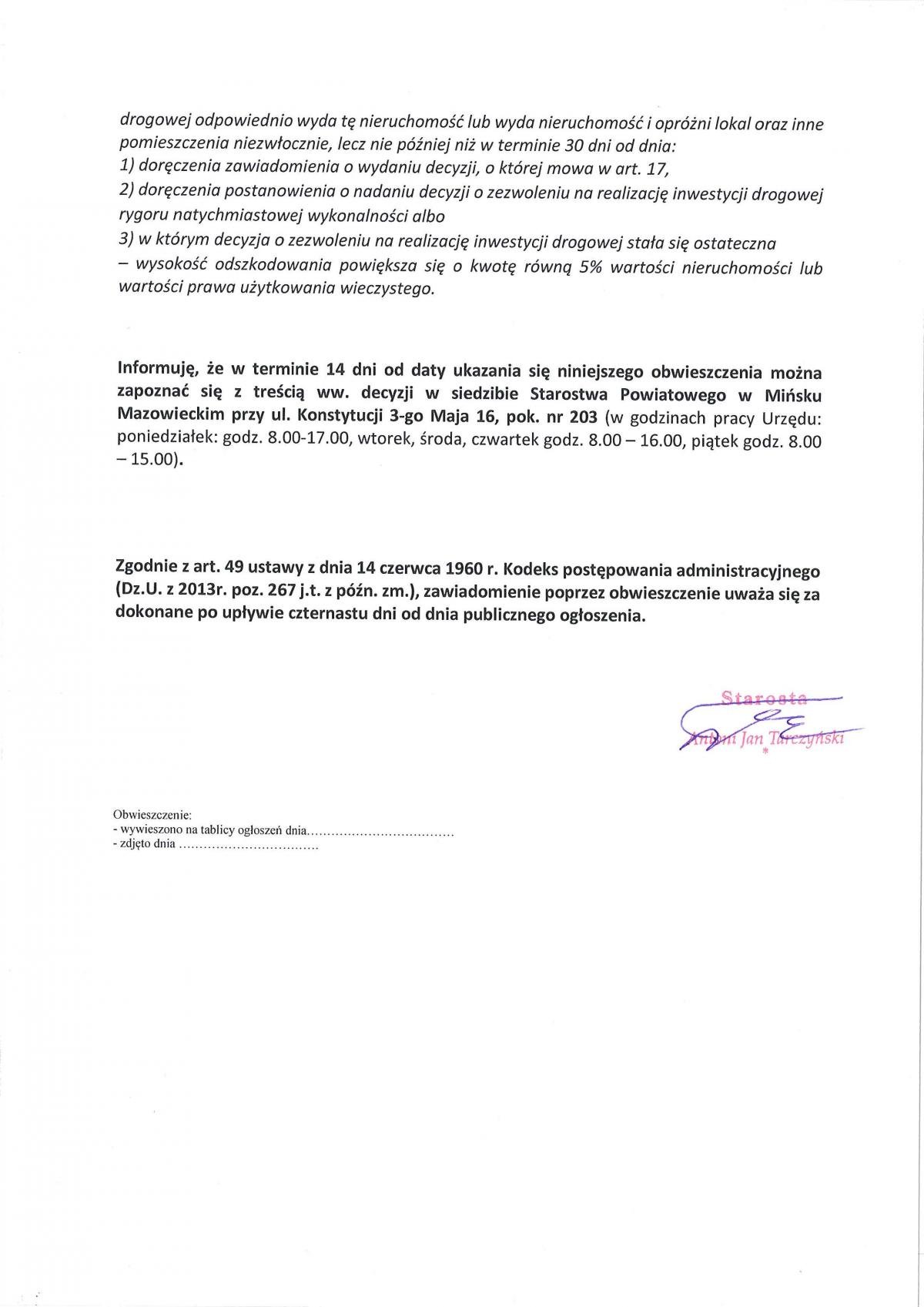 Obwieszczenie Starosty Mińskiego o wszczęciu postępowania w sprawie wydania decyzji o zezwoleniu na realizację inwestycji drogowej |