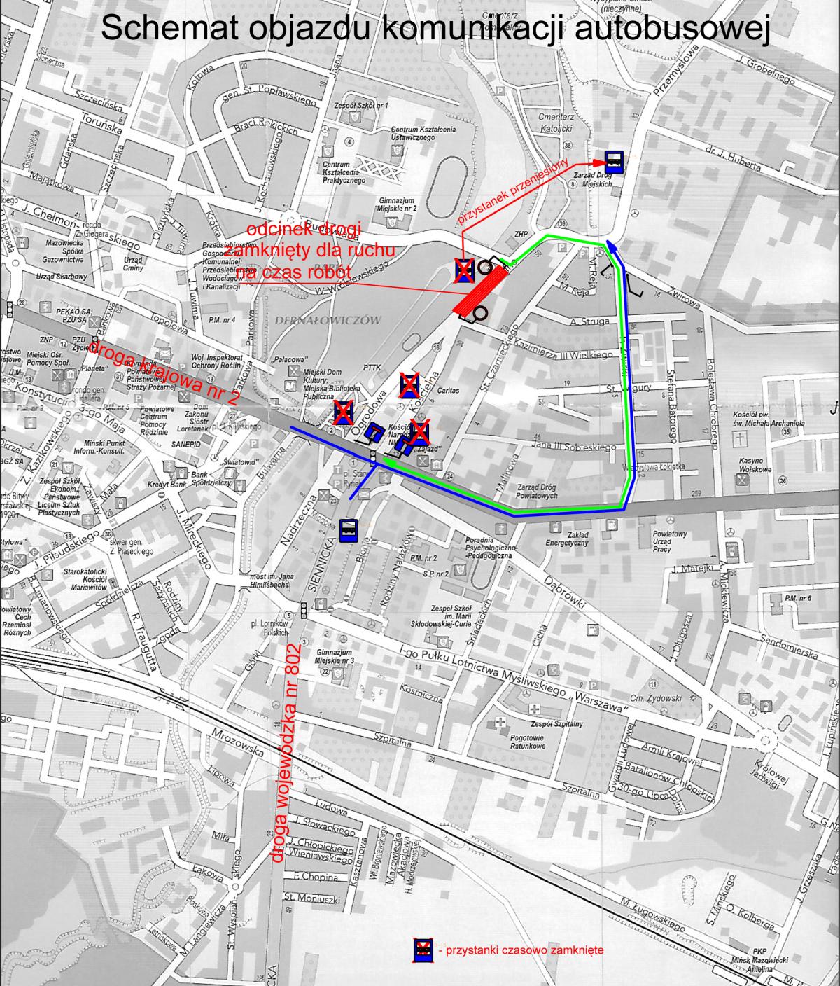 W związku z powyższym wyłączony zostanie z ruchu odcinek ulicy Konstytucji 3 Maja od skrzyżowania z ulicą Kazikowskiego do skrzyżowania z ulicami Piłsudskiego i Mireckiego.