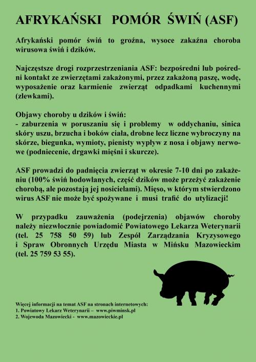 ASF prowadzi do padnięcia zwierząt w okresie 7-10 dni po zakażeniu (100% świń hodowlanych, część dzików może przeżyć zakażenie chorobą, ale pozostają jej nosicielami). Mięso, w którym stwierdzono wirus ASF nie może być spożywane i musi trafić do utylizacji!