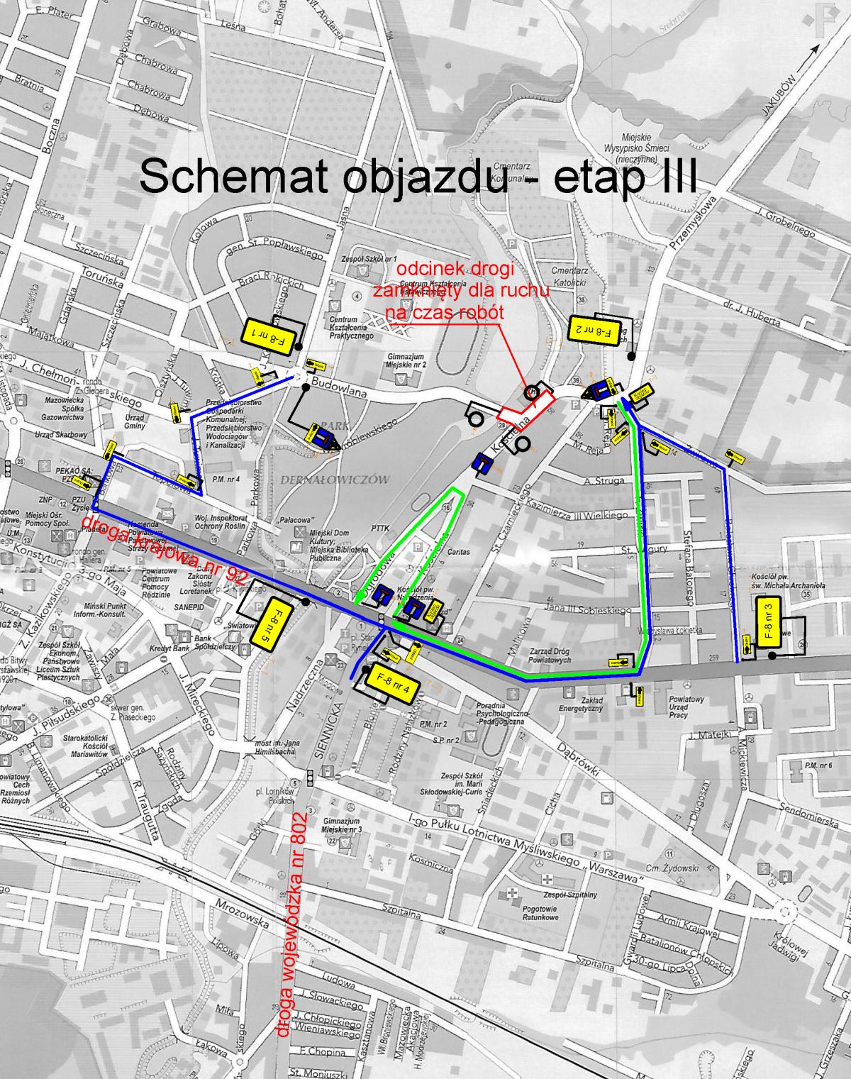 W załączeniu przedstawiamy planowane schemat organizacji ruchu na czas prowadzonych prac w III etapie. Prace prowadzone są przez Zarząd Dróg Powiatowych w Mińsku Mazowieckim, ul. Warszawska 219, tel. 25 758 28 91.