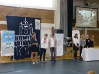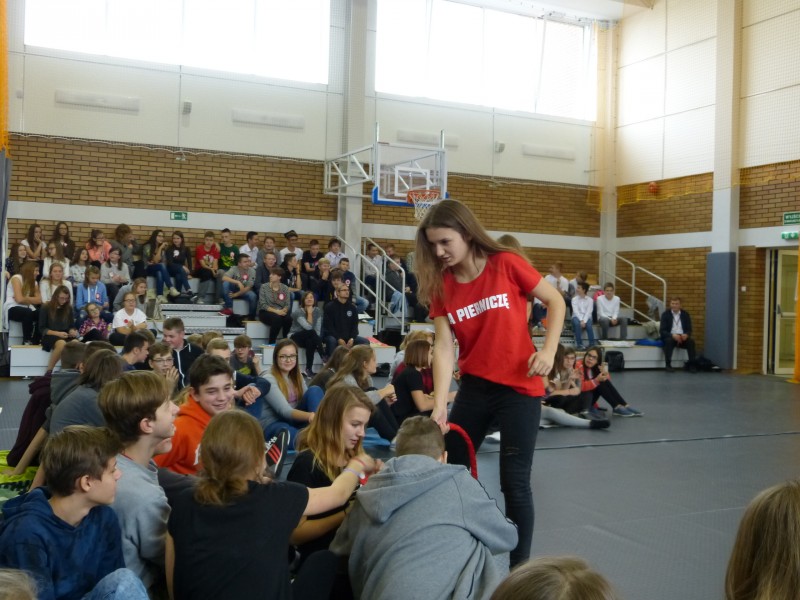 Wesoły autobus wyruszył, by dotrzeć do pierwszego przystanku – PODLASIE. Tu uczniowie klas 1b i 1h recytowali i śpiewali w językach mniejszości narodowych i etnicznych zamieszkujących ten region Polski. Goście słuchali języka rosyjskiego, ukraińskiego, litewskiego, ale też tatarskiego i romskiego. Dowiedzieli się, że Podlasie to styk kultur i religii. Z zachwytem patrzyli na tancerzy w ludowych strojach i słuchali chóru greko-katolickiego, zajadając się przy tym regionalnym sękaczem. Drugim przystankiem, do którego dotarli było Świętokrzyskie. Tu rządziły czarownice z Łysej Góry i mroczne legendy o sabatach i nocnych wiecach. W quizie trzeba było wykazać się wiedzą także o świętokrzyskich zamkach – Chęciny i Krzyżtopór i najsłynniejszej jaskini tej części Polski – Jaskini Raj. Oglądając film z wyprawy kl. 1f i 1c w Świętokrzyskie, uczestnicy pikniku posmakowali świętokrzyskich przysmaków – grycoków, czyli pierogów z kaszą gryczaną i szarlotki i musieli z powrotem wsiadać do autobusu, by ruszać dalej. Piosenką i pokazem zdjęć przywitał wszystkich Poznań, który prezentowały klasy językowe – 1e i 1g. Goście dowiedzieli się, że poznańskie koziołki to Pyrek i Tyrek; wiedzą też, co znajduje się na słynnych drzwiach gnieźnieńskiej katedry i gdzie był koronowany Mieszko I. Poznali również kilka słów z gwary wielkopolskiej, a za wykazanie się tą wiedzą można było posmakować rogali świętomarcińskich. Ostatnim przystankiem podróży był Toruń – miasto Mikołaja Kopernika i pięknej gotyckiej architektury. Nie zabrakło krzyżackich rycerzy z 1d i toruńskich mieszczek oraz gwiazdek z 1a. Bardzo podobał się taniec gwiazd i gawęda o powstaniu najsłynniejszych toruńskich pierników – katarzynek. Pierniki, którymi częstowano, pachniały miodem.