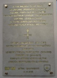 „W TYM MIEJSCU 15 VIII 1906 R. CZŁONKOWIE ORGANIZACJI BOJOWEJ POLSKIEJ PARTII SOCJALISTYCZNEJ POD DOWÓDZTWEM TOMASZA ARCISZEWSKIEGO DOKONALI UDANEGO ATAKU NA FUNKCJONARIUSZY ROSYJSKICH STACJONUJĄCYCH W BUDYNKU POCZTY / TOMASZ ARCISZEWSKI (1877-1955), WSPÓŁORGANIZATOR PPS W MIŃSKU MAZOWIECKIM, LEGIONISTA, MINISTER POCZT I TELEGRAFÓW (1918-1919), PREMIER RP (1944-1947), KAWALER ORDERU VIRTUTI MILITARI I KRZYŻA NIEPODLEGLOŚCI Z MIECZAMI / MIŃSK MAZOWIECKI 9 XI 2016”