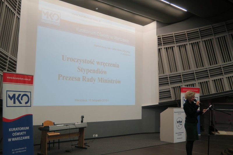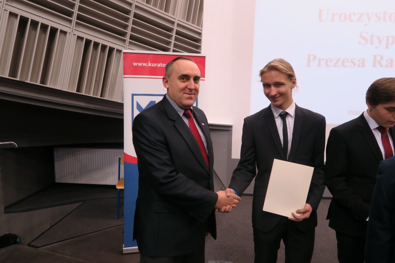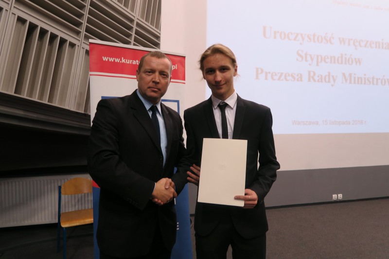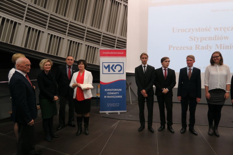 Uroczystość odbyła się w dniu 15 listopada w Wyższej Szkole Menadżerskiej w Warszawie. Wręczenia stypendium dokonał Mazowiecki Kurator Oświaty Pani Aurelia Michałowska, Mazowiecki Wicekurator Oświaty Pani Dorota Skrzypek oraz Dyrektor Departamentu Edukacji Publicznej i Sportu Urzędu Marszałkowskiego Pan Mirosław Krusiewicz. Uczniowi Kacprowi Jakubiakowi w tym radosnym dniu towarzyszył dyrektor Tomasz Płochocki. Serdecznie gratulujemy i życzymy dalszych sukcesów i rozwoju.