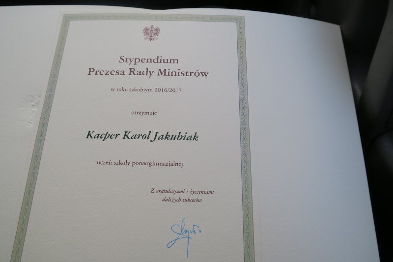 Z ogromną radością i satysfakcją przekazujemy wiadomość o otrzymaniu Stypendium Prezesa Rady Ministrów przez Kacpra Jakubiaka, ucznia Technikum- technik mechatronik Zespołu Szkół Zawodowych nr 2 im. Powstańców Warszawy w Mińsku Mazowieckim.