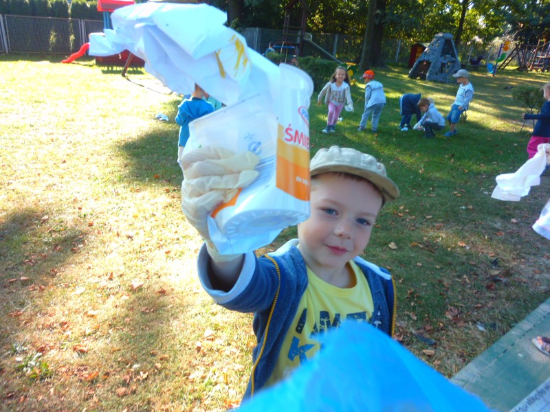We wrześniu włączyliśmy się w akcję „Sprzątanie świata”. Przedszkolaki wyposażone w rękawiczki i worki zbierały śmieci na terenie wokół przedszkola; wykonały też prace plastyczno-techniczne nadając „drugie życie” materiałom odpadowym; prace te można było oglądać w holu przedszkola. Były tam lornetki, gąsienice, sygnalizatory świetlne itp.