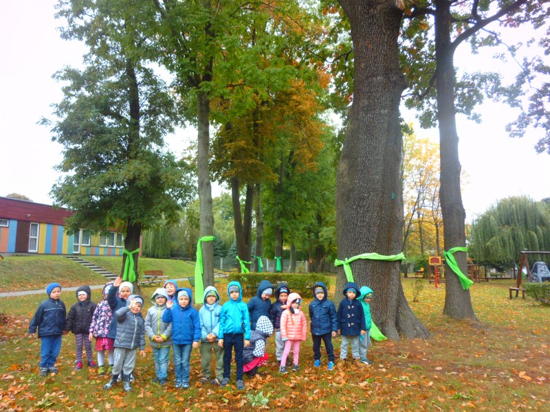 10. 10. 2016r. obchodziliśmy Dzień Drzewa. Mamy ten przywilej, że na naszym terenie rośnie wiele drzew różnych gatunków, a wśród nich dąb szypułkowy będący Pomnikiem Przyrody. Chcąc uświadomić naszym wychowankom jak ogromną rolę w przyrodzie odgrywają drzewa postanowiliśmy ten dzień świętować szczególnie. We wszystkich grupach odbyły się ciekawe zajęcia, zabawy badawcze w ogrodzie, pokazy multimedialne, dzięki którym dzieci poszerzały wiedzę o drzewach, bogaciły dziecięcy słownik o pojęcia związane z drewnem i jego przetwarzaniem, kształtowały postawę szacunku wobec drzew. Wszystkie drzewa na naszym terenie opasane zostały zielonymi wstęgami. Pomimo jesiennej słoty nasz teren wyglądał tego dnia inaczej niż zwykle - świątecznie. Kolejny etapem świętowania było wykonanie drzew różnymi technikami plastycznymi. Prace te ozdobiły przedszkolny hol.