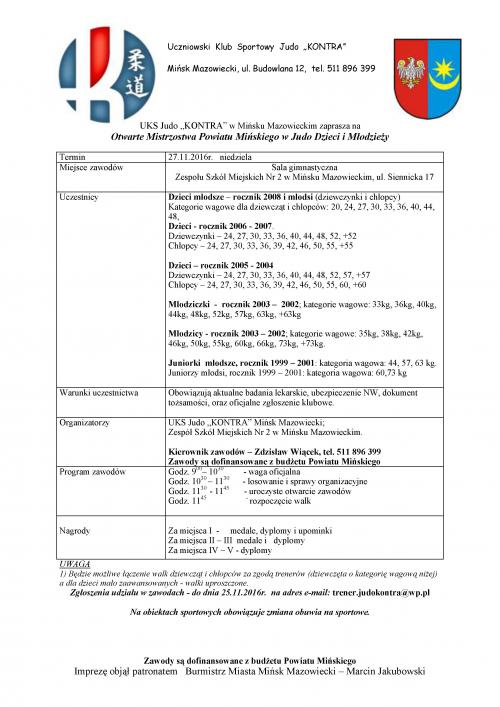 Serdecznie zapraszamy na Otwarte Mistrzostwa Powiatu Mińskiego Dzieci i Młodzieży w Judo, które odbędą się w Mińsku Mazowieckim w dniu 27 listopada 2016r. w Zespole Szkół Miejskich Nr 2, ul. Siennicka 17. Rozpoczęcie walk - godzina 11.30