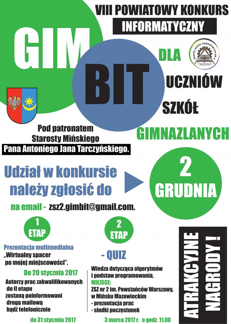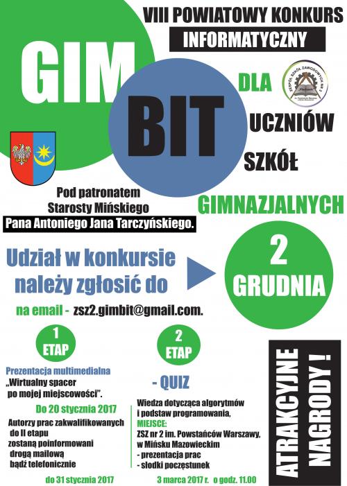 Konkurs informatyczny dla gimnazjalistów Powiatu Mińskiego pod Patronatem Starosty Mińskiego, VIII Powiatowy Konkurs Informatyczny GIM BIT edycja 2016/17 Zespół Szkół Zawodowych nr 2 im. Powstańców Warszawy w Mińsku Mazowieckim serdecznie zaprasza uczniów szkół gimnazjalnych wraz z nauczycielami informatyki do wzięcia udziału w VIII POWIATOWYM KONKURSIE INFORMATYCZNYM „GIM-BIT” edycja 2016/17 pod patronatem Starosty Mińskiego Pana Antoniego Jana Tarczyńskiego.