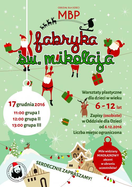 Ho! Ho! Hooo! Witajcie pomocnicy Świętego Mikołaja. Ja zwykle przed Gwiazdką Mikołaj ma bardzo dużo pracy. Wasza pomoc będzie niezbędna. Od 6 grudnia możecie zapisywać się w Oddziale dla Dzieci na listę pomocników. Warsztaty tworzenia ozdób choinkowych, dekoracji, robienia kartek świątecznych otwieramy 17 grudnia.