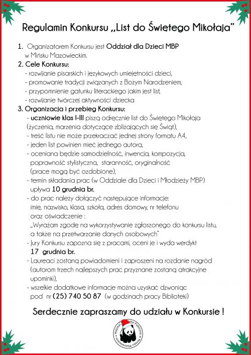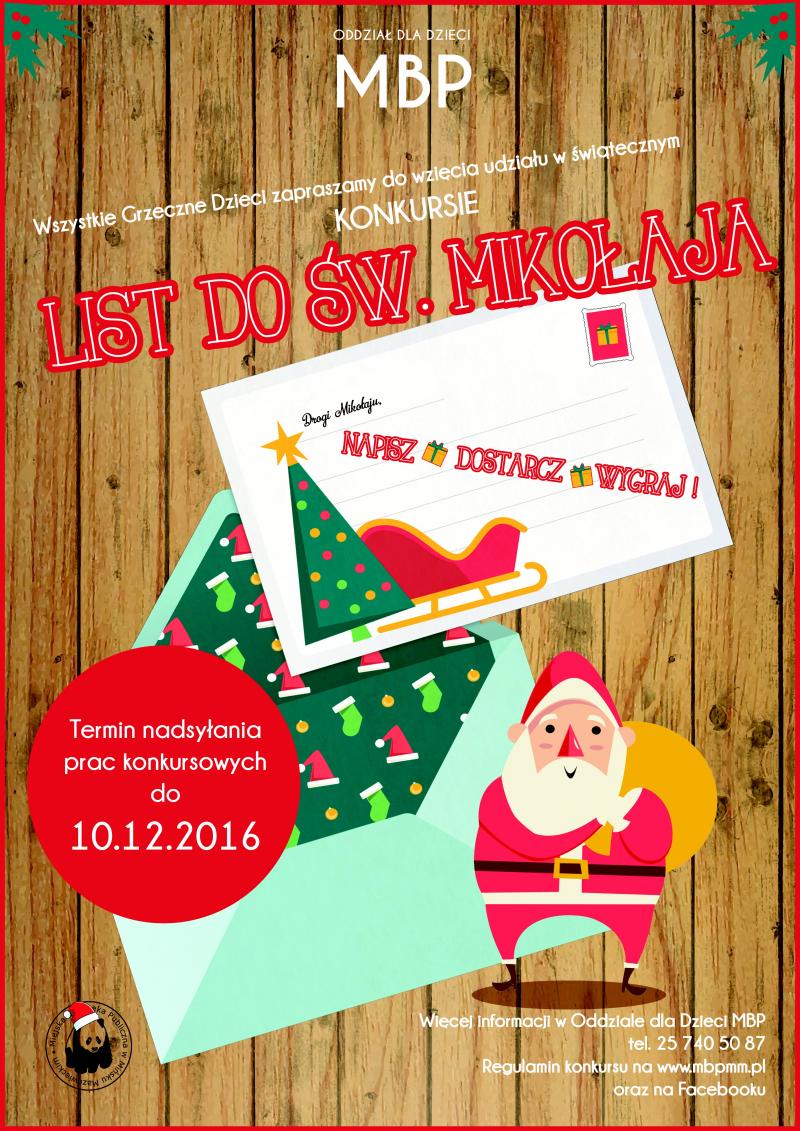 Pisanie listów do Świętego Mikołaja to już tradycja. W tym roku MBP przygotowała konkurs, którego celem jest napisanie takiego listu. Serdecznie zachęcamy do wzięcia w udziału konkursie. Mocno wierzymy w to, że każda praca będzie wyjątkowa, tak samo, jak jej autor. Na zwycięzców czekają świąteczne podarki :).