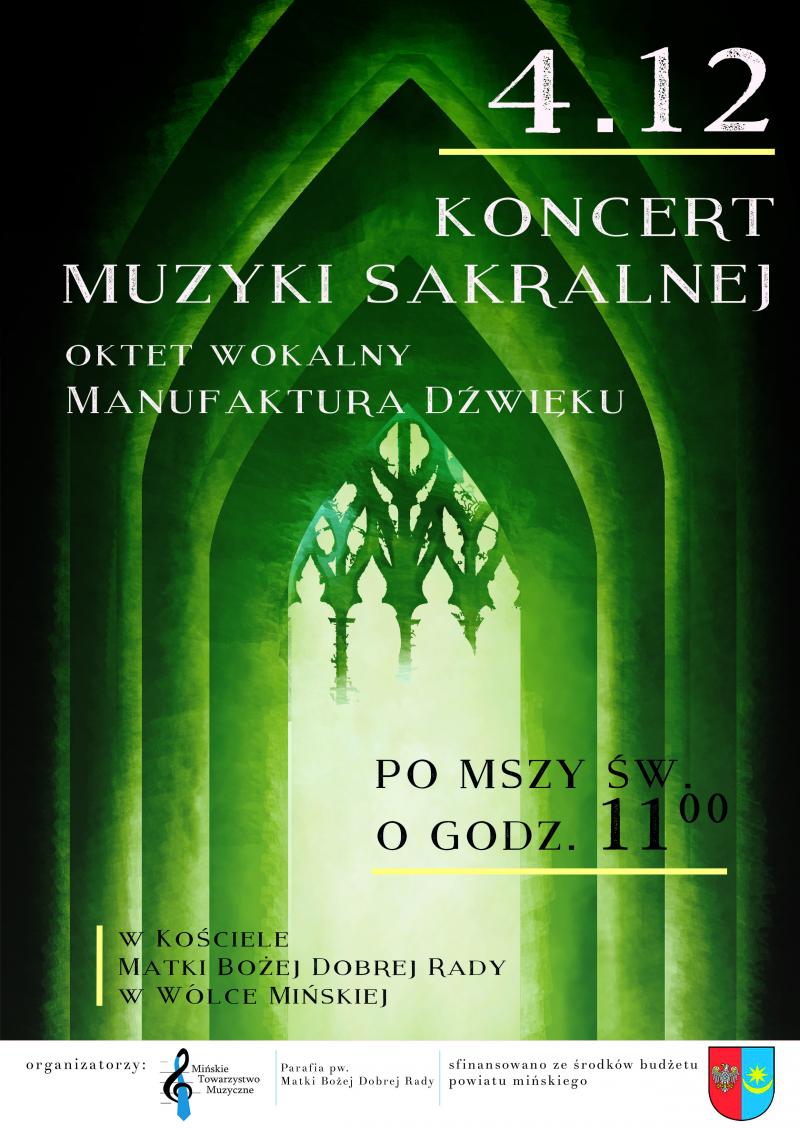 Mińskie Towarzystwo Muzyczne zaprasza na koncert muzyki sakralnej w niedzielę 4 grudnia, po mszy o godz. 11 do Wólki Mińskiej - kościół pw. Matki Bożej Dobrej Rady. Koncert sfinansowano ze środków budżetu Powiatu Mińskiego.