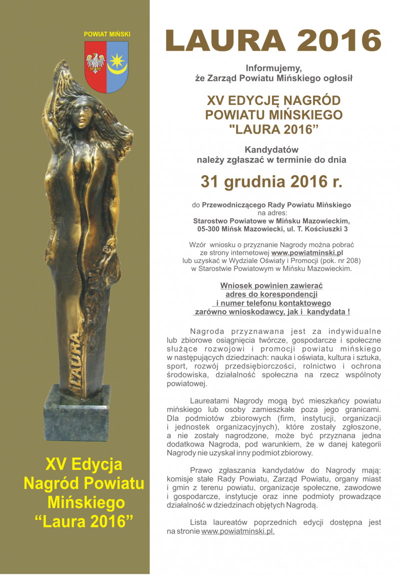 Zarząd Powiatu Mińskiego ogłosił XV edycję Nagród Powiatu Mińskiego LAURA 2016. Nagroda przyznawana jest za indywidualne lub zbiorowe osiągnięcia twórcze, gospodarcze i społeczne służące rozwojowi i promocji powiatu mińskiego w następujących dziedzinach: nauka i oświata, kultura i sztuka, sport, rozwój przedsiębiorczości, rolnictwo i ochrona środowiska, działalność społeczna na rzecz wspólnoty powiatowej.