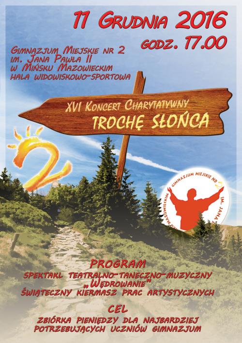 Gimnazjum Miejskie nr 2 im. Jana Pawła II w Mińsku Mazowieckim zaprasza na XVI Koncert Charytatywny „Trochę słońca”. Odbędzie się on po raz pierwszy w budynku szkoły przy Budowlanej – w nowej hali widowiskowo-sportowej. Początek charytatywnego spotkania 11 grudnia (niedziela) o godz. 17.00.