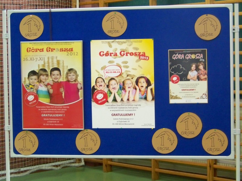 W ubiegłym roku szkolnym Szkoła Podstawowa nr 2 im. Dąbrówki w Mińsku Mazowieckim tradycyjnie przystąpiła do akcji charytatywnej organizowanej przez Towarzystwo Nasz Dom. Była to już XVI edycja „Góry Grosza”, której celem jest zebranie funduszy na pomoc dzieciom wychowującym się poza własną rodziną, w tym na tworzenie i dofinansowanie domów dla dzieci, rodzinnych domów dziecka, pogotowi rodzinnych, kwalifikowanych rodzin zastępczych oraz dla najbardziej potrzebujących domów dziecka, które realizują prorodzinne programy wychowawcze.