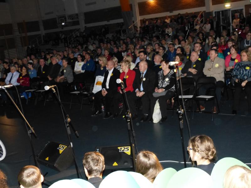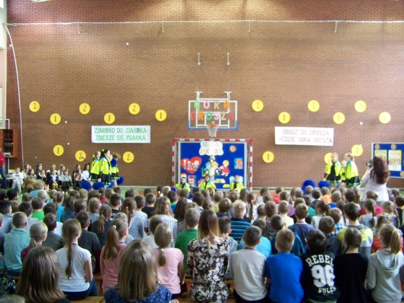 Na początku spotkania wszystkich bardzo serdecznie przywitał pan dyrektor Sławomir Domański. Następnie zgromadzeni obejrzeli występ szkolnej grupy „cheerleaders”, której członkinie zaprezentowały swoje umiejętności w układzie „Cheer Show”. W dalszej części spotkania pani Ewa Serafin szczegółowo przypomniała cel akcji. Później szkolny chór pod kierunkiem pani Anety Senktas zaśpiewał piosenkę Orkiestry Dni Naszych „Nie ma jak dom”, która co roku towarzyszy zbiórce pieniędzy. W dalszej części uroczystości prowadząca odczytała wyniki ubiegłorocznej akcji, a Członkowie Szkolnego Koła Gimnastyki Artystycznej w układzie piramid pokazali, jak wielką górę monet udało się zebrać.