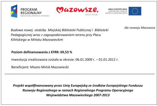 Inwestycję zrealizowano w całości ze środków własnych Miasta, przy wsparciu Województwa Mazowieckiego, które pokryło koszty dotyczące Biblioteki Pedagogicznej (filii Biblioteki Pedagogicznej w Siedlcach). W październiku 2015 roku pojawiła się możliwość uzyskania zwrotu części poniesionych nakładów. Ogłoszono nabór propozycji projektów do umieszczenia na liście rezerwowej Indykatywnego Wykazu Indywidualnych Projektów Kluczowych RPO WM 2007-2013. Mimo bardzo krótkiego terminu na złożenie Zgłoszenia, Burmistrz Miasta podjął decyzję o przygotowaniu wszystkich niezbędnych dokumentów i zgłoszeniu zrealizowanej inwestycji. W grudniu 2015 roku decyzją Zarządu Województwa Mazowieckiego projekt Miasta pn. „Budowa nowej siedziby Miejskiej Biblioteki Publicznej i Biblioteki Pedagogicznej wraz zagospodarowaniem terenu przy Placu Kilińskiego w Mińsku Mazowieckim” został ujęty w ramach listy rezerwowej Działania 6.1 Kultura Indykatywnego Wykazu Indywidualnych Projektów Kluczowych dla RPO WM 2007-2013. W trybie pilnym przygotowywano wszystkie niezbędne dokumenty. Ocena złożonego wniosku o dofinansowanie oraz przeprowadzenie kontroli projektu umożliwiły podpisanie umowy warunkowej, a w konsekwencji złożenie wniosku o płatność.