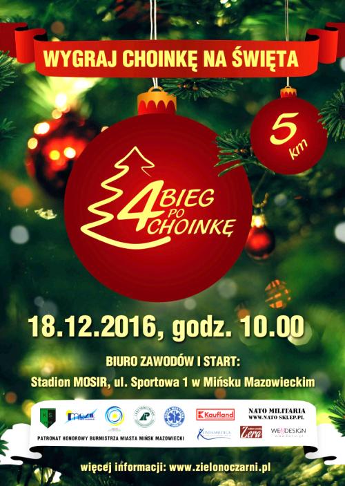 Klub Sportowy "Zielono-Czarni', Nadleśnictwo Mińsk Mazowiecki oraz Miejski Ośrodek Sportu i Rekreacji zapraszają na "IV Bieg Po Choinkę". Patronat honorowy nad zawodami objął Burmistrz Mińska Mazowieckiego Pan Marcin Jakubowski. 18 grudnia 2016, 10.00 Stadion MOSiR, ul. Sportowa 1