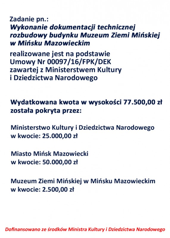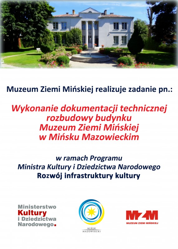 Muzeum Ziemi Mińskiej informuje, iż zadanie pn. "Wykonanie dokumentacji technicznej rozbudowy budynku Muzeum Ziemi Mińskiej" zostało dofinansowane ze środków Ministerstwa Kultury i Dziedzictwa Narodowego.