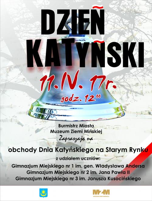 Burmistrz Miasta Mińsk Mazowiecki oraz Muzeum Ziemi Mińskiej zapraszają dnia 11.04.2017r. o godz. 12.00 na Stary Rynek na obchody Dnia Katyńskiego. Uroczystości odbędą sie przy udziale uczniów z mińskich gimnazjów: Gimnazjum Miejskiego nr 1 im. gen. Władysława Andersa, Gimnazjum Miejskiego nr 2 im. Jana Pawła II oraz Gimnazjum Miejskiego nr 3 im. Janusza Kusocińskiego.