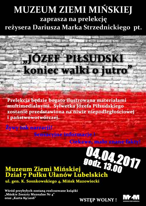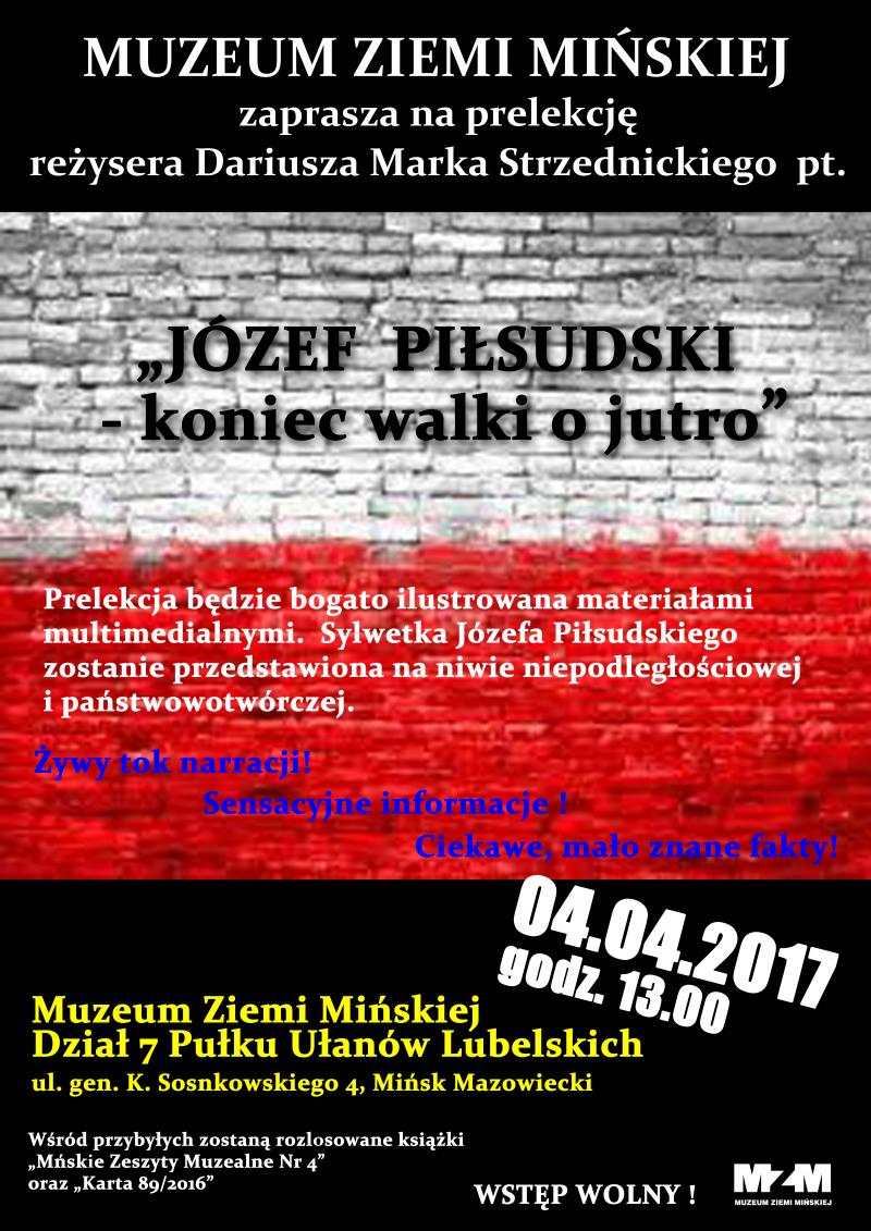 Dnia 4 kwietnia br. o godz. 13.00 w Muzeum Ziemi Mińskiej Dział 7 Pułku Ułanów Lubelskich odbędzie się bogato ilustrowana materiałami medialnymi prelekcja Pana Dariusza Marka Strzednickiego reżysera przedstawień teatralnych i filmów historycznych pt. "Józef Piłsudski - koniec walki o jutro"