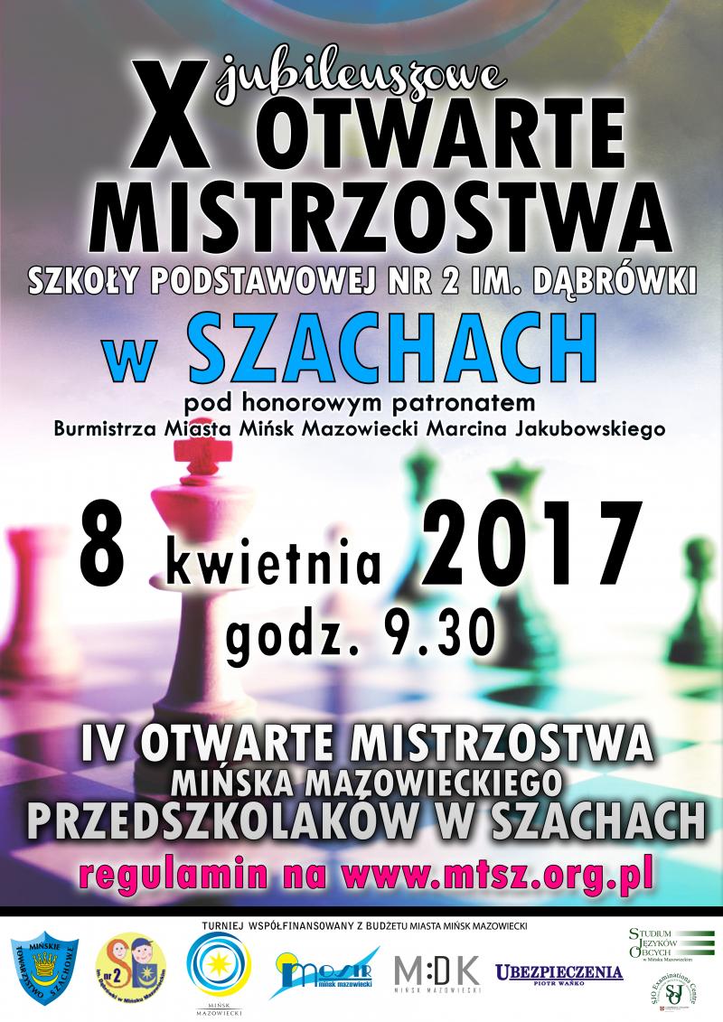 Zapraszamy na X JUBILEUSZOWE OTWARTE MISTRZOSTWA SZKOŁY PODSTAWOWEJ NR 2 IM. DĄBRÓWKI W SZACHACH W MIŃSKU UL.DĄBRÓWKI 10, które odbędą się dnia 8 KWIETNIA 2017 o godz.9.30. W ramach zawodów szachowych odbędą się trzy turnieje w poszczególnych grupach wiekowych: turniej A-szkoły ponadpodstawowe, B-szkoły podstawowe klasy IV-VI i C-szkoły podstawowe klasy I-III i młodsi adepci gry. Na zawodników czekają puchary, medale i nagrody rzeczowe.