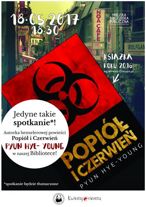 Autorka bestselerowej powieści "Popiół i czerwień" Pyun Hye-young odwiedzi naszą Bibliotekę! Dzięki Wydawnictwu Kwiaty Orientu, mamy zaszczyt zaprosić naszych czytelników na wyjątkowe spotkanie z przedstawicielką współczesnej literatury koreańskiej, która odwiedza nasz kraj z okazji Warszawskich Targów Książki.