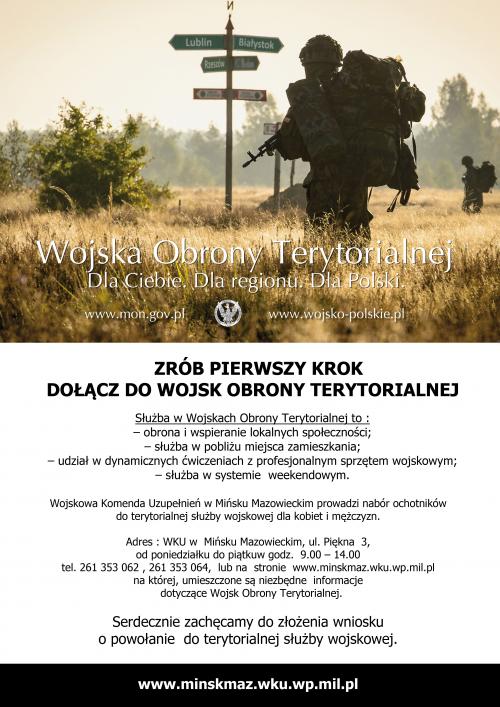 W Wojskowej Komendzie Uzupełnień w Mińsku Mazowieckim otwarty jest punkt informacyjny dla kandydatów do służby w Wojskach Obrony Terytorialnej, w którym można uzyskać szczegółowe informacje na temat Terytorialnej Służby Wojskowej.