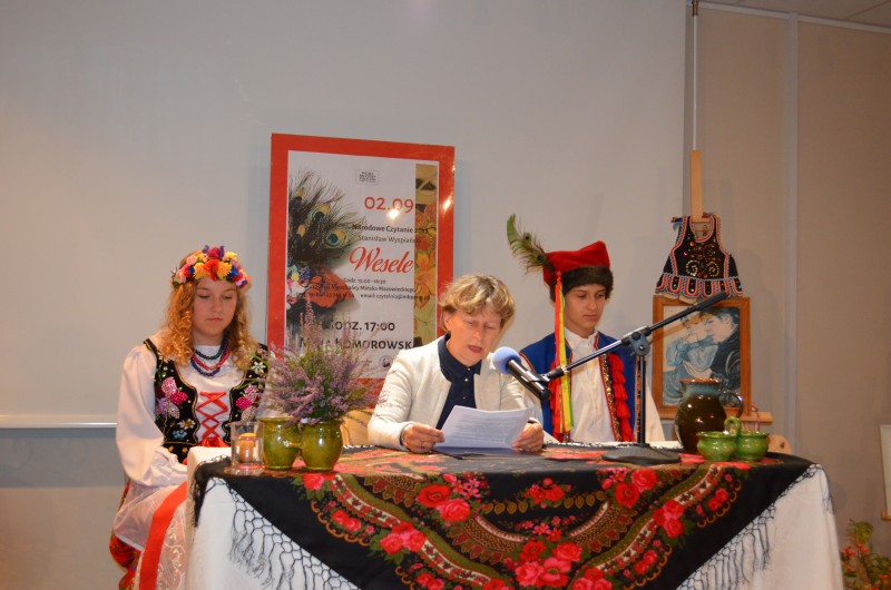 Tym razem Narodowe czytanie odbyło się wewnątrz biblioteki, a nie tak jak w latach poprzednich w plenerze. Słuchaczy witała para młodych wolontariuszy Fundacji EBU w strojach krakowskich, a scena nawiązywała do ludowo-mieszczańskiego ślubu Lucjana Rydla z Jadwigą Mikołajczykówną. Był nawet słomiany chochoł, tak istotny w dramacie Wyspiańskiego. Punktualnie o godz. 15 czytanie fragmentów „Wesela” rozpoczęła Elżbieta Sieradzińska, dyrektor MBP, a po niej na scenie zasiedli kolejno: członkowie Stowarzyszenia „Radość trzeciego wieku” i Miejskiej Rady Seniorów, nauczyciele ze Szkoły Podstawowej nr 3 im. Jana Pawła II (dawnego Gimnazjum Miejskie nr 2), radni miejscy Robert Gałązka i Kazimierz Markowski, Arkadiusz Łukasiak z synem oraz Katarzyna Piłka i Joanna Kępczyk z Zespołu Szkół Ekonomicznych. Dziękujemy im serdecznie za wspólną lekturę!