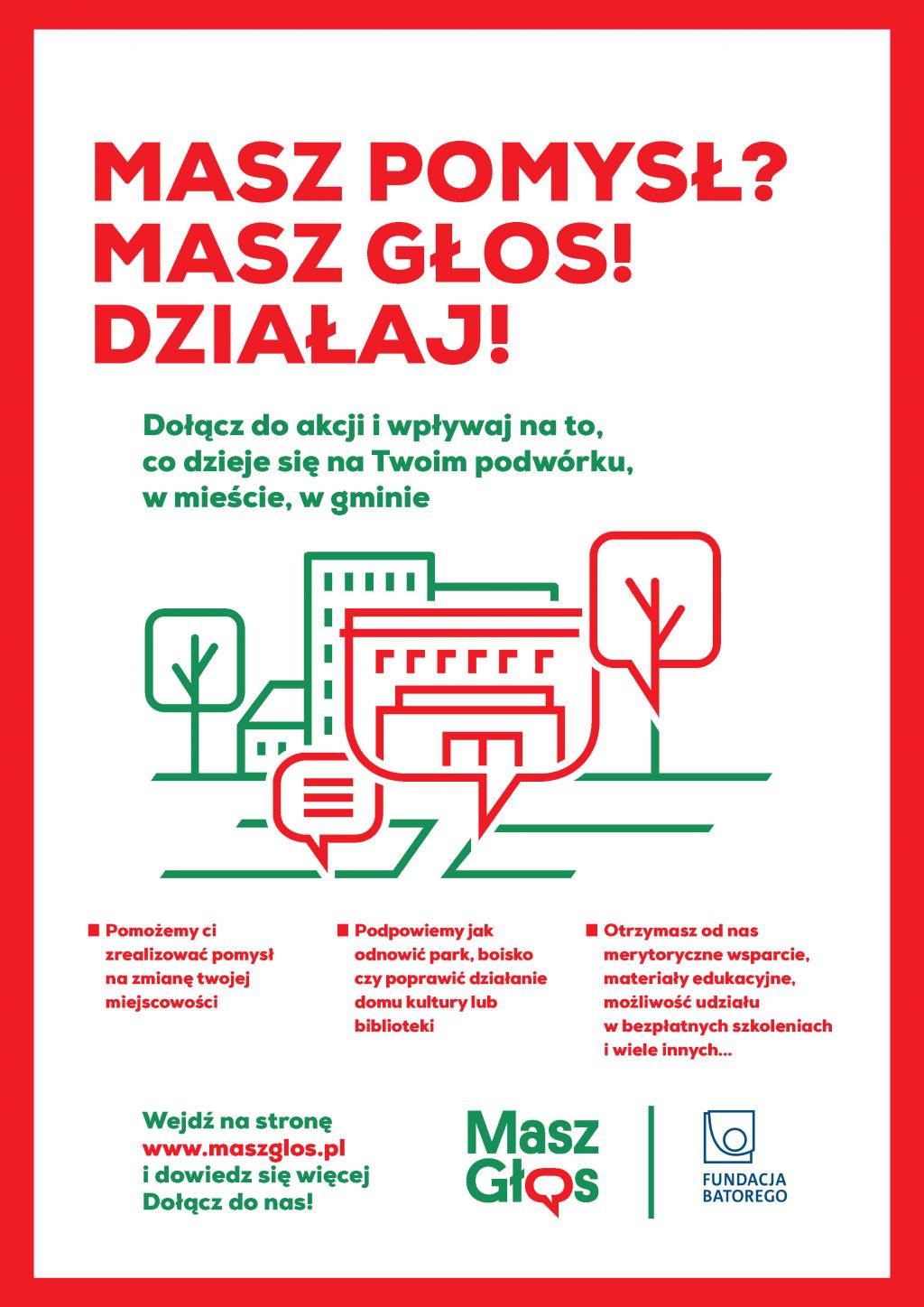 po raz kolejny rozpoczynamy nabór do akcji Masz Głos, która jest jedyną ogólnopolską akcją angażującą mieszkańców i mieszkanki oraz władze lokalne do dialogu i współpracy na poziomie samorządowym. Organizowana jest, aby włączać mieszkańców i mieszkanki w życie publiczne, zachęcać do działania i pokazywać, że mogą być współodpowiedzialni za losy swojej gminy.