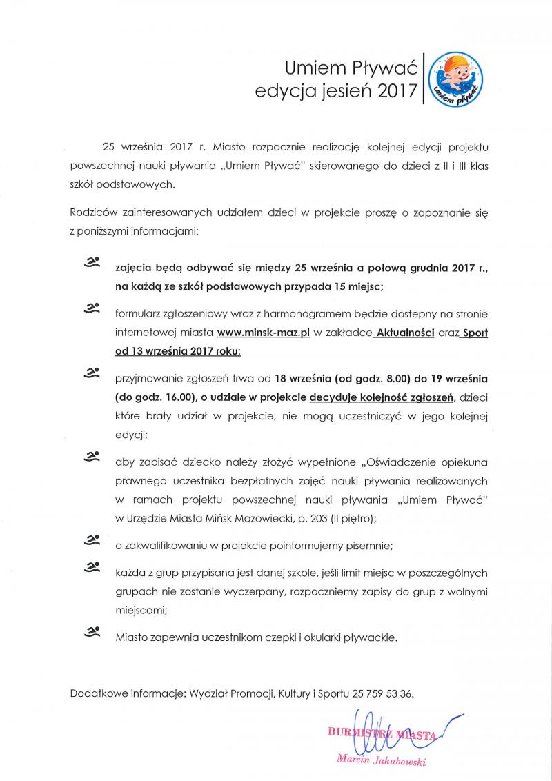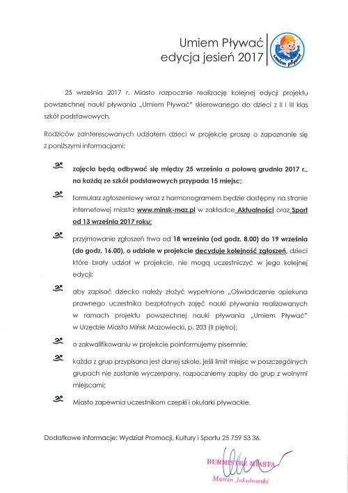 Uprzejmie informujemy, że rekrutacja do Programu "Umiem Pływać" została zakończona. Na basenie rozpoczęły się już pierwsze zajęcia z nauki pływania dla dzieci z klas drugich i trzecich mińskich szkół.