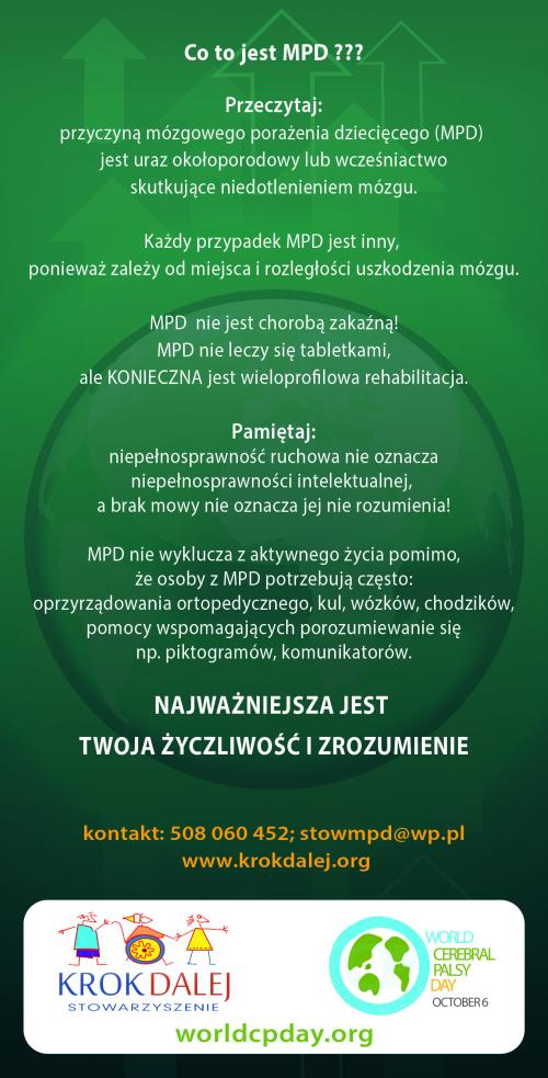 Serdecznie zapraszam do udziału w zgromadzeniu zorganizowanym przez Stowarzyszenie "Krok Dalej" dla uczczenia Światowego Dnia Mózgowego Porażenia Dziecięcego - WORLD CEREBRAL PALSY DAY.