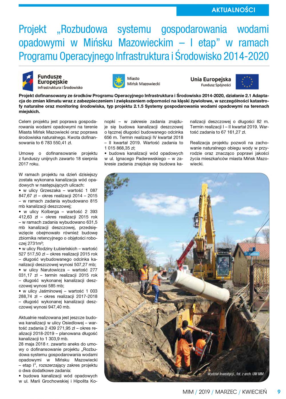 Celem projektu jest poprawa gospodarowania wodami opadowymi na terenie Miasta Mińsk Mazowiecki oraz poprawa środowiska naturalnego. Kwota dofinansowania to 6 783 550,41 zł.